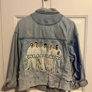 Stylish light blue jean jacket. Features graphic design on back. Distressed details add character.