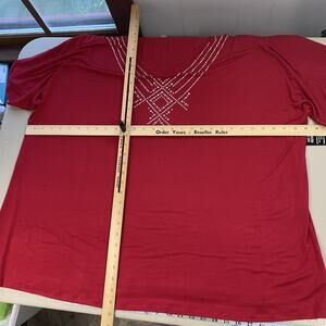 Womens plus size tunic shirt in a rich red hue with a rhinestone geometric design along the V-neckline.