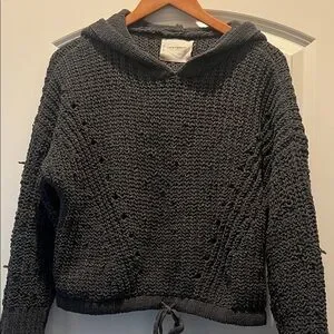 Chunky knit with a cozy hoodie. Drawstring bottom.