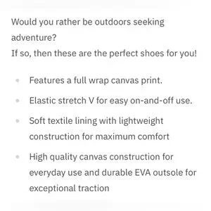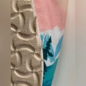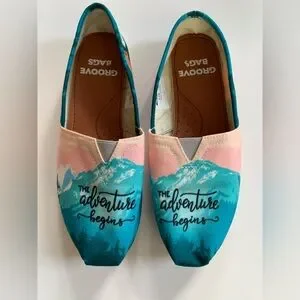 These shoes are so cute! Groove Bags Custom Kicks Brand - The Adventure Begins flats. Mountains on the toes with the words, camper on the sides. These are like new without tags. See the pictures for the soles - no wear, a little discoloration and one has silver sharpie on it. Edges are a bit rough but could be trimmed. On the toe you can see a little glue residue. These are INCREDIBLY lightweight. Full wrap canvas print, v-notch for easy on. Colors are pink, blue, orange white.