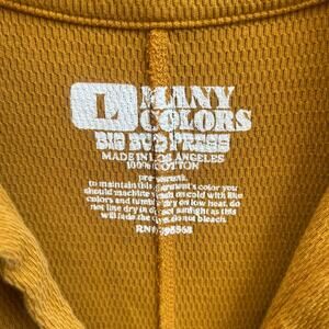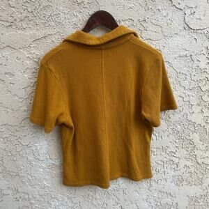 Big Bud Press short sleeve Fisherman Polo in mustard. Waffle knit 100% cotton, made in Los Angeles. Soft textured fabric with an open V-placket collar. Light general wear but overall great shape. Size womens large.
