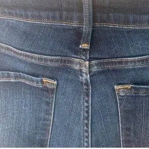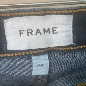 2% elastane. Has stretch. Mid-rise. Great condition. Only real signs of wear is Frame gold tone button is scratched - see last photo. And a little extra faded area on the back near waistband - See 2nd to last photo. Not sure if this is how they were designed/sold. (I am selling these for my daughter). Just wanted to point it out! Approximate measurements (taken when laying flat - cannot guarantee fit):