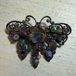 Gorgeous vintage butterfly brooch featuring detailed openwork filigree wings, hand-wired gemstone-style beads, and a beautifully textured mixed-metal finish. This piece is full of character and craftsmanship, with each bead individually wired onto the frame for a true artisan look.