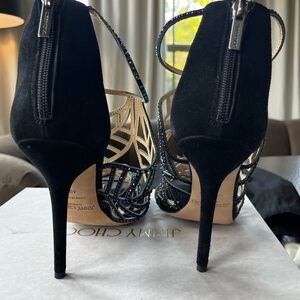 Chic Jimmy Choo heels with intricate strappy design. Black and teal accents for a bold look. Perfect for elegant events. Comes with dust bag and box