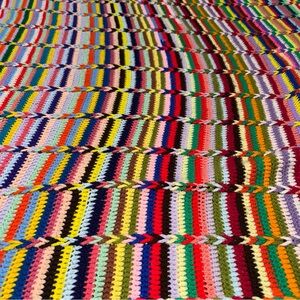 Not perfect but it is homemade! Vibrant and beautifully handmade crocheted afghan featuring bold multicolor striping in a textured stitch pattern. This large blanket adds warmth, personality, and a cozy handmade touch to any room. Perfect for beds, couches, or as a colorful accent piece.