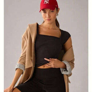 NWOT Pilcro Anthropologie Square Neck Black Cotton Cap Sleeve Top Shirt M Petite