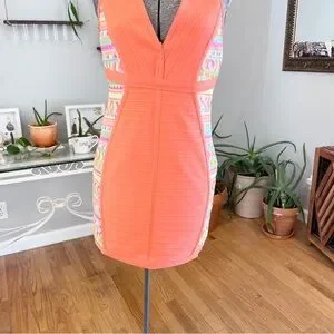 Stylish V-neck sleeveless bandage dress. Features vibrant side panels with a mix of colors. Perfect for a night out.