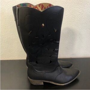 Rampage Black Faux Leather Tall Heeled Boot. Size 8 (no size tag, but fits 8. See measurements) Black faux leather (no materials tag) punched out see thru style western design. Minor general wear with marks and scratches. Gently worn in good condition.