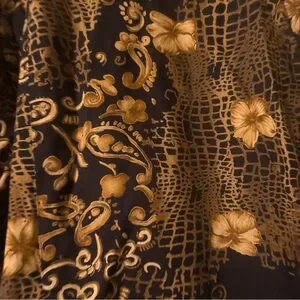 Stylish stretchy black bomber jacket with intricate gold patterns. Features a classic collar and hidden button closure. Side front pockets. Cotton, spandex. Machine washable. Sz 3X. PTP 28”, length 25”. NWOT.