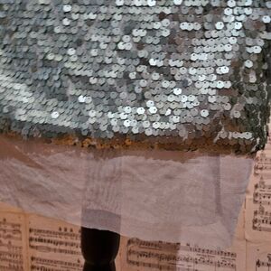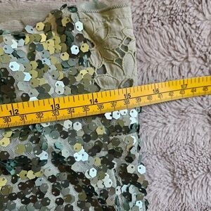 Marked US size 10 but better fit for 6-8 due to tight fit. Chest measures 15 inches or 39 cm wide, length is 30 inches or 76 cm long. Very cute light seafoam green sequin and mesh strapless dress with embroidered floral pattern chest. Be the talk of the event with this stunner!