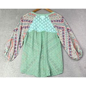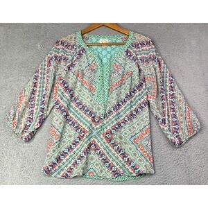Anthropologie Fig and Flower Blouse Womens Size Medium Teal Multicolor Sheer