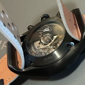 Tom Ford N002 Automatic TF1201256683 Watch With 43mm Black Face With White Hands & Hourmarkers Numbers & Exhibition Back Case Displaying Watch Movement & White Leather Band.