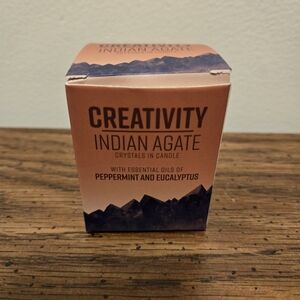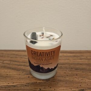 4oz soy wax candle with natural Indian Agate gemstone chips, essential oils of peppermint and eucalyptus with lead free cotton wick. Hand poured in the USA
