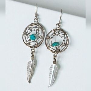 unique vintage native American silver 2.5-in feather and dreamcatcher earrings with genuine turquoise.