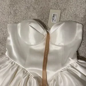 Elegant strapless mini dress. Features a sweetheart neckline. Flared skirt design. Perfect for special occasions.