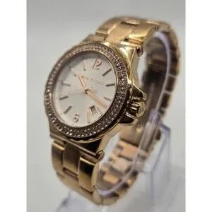 The MICHAEL KORS Glitz MK-5921 Ladies' Rose Gold Tone Watch features a stylish design with a 12-hour bezel in a combination of gold and rose gold. This elegant timepiece has a bracelet band made of stainless steel with a width of 14mm, suitable for a maximum wrist size of 6.76-7 inches. The watch has a quartz movement and is water-resistant up to 100m, making it perfect for everyday wear. Additionally, the watch includes features such as a date indicator, gemmed accents, and a 12-hour dial, adding to its charm and functionality. Perfect for women who appreciate a blend of dressy and casual style.