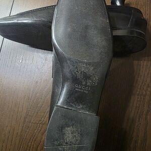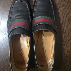 Sleek black leather loafers. Features green and red stripe detail. Ideal for a refined look.