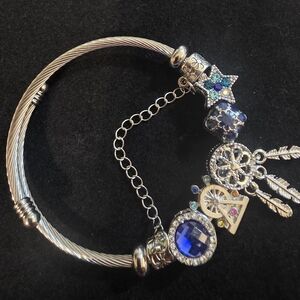 Elegant silver charm bracelet featuring stunning blue accents. Perfect for adding a touch of sophistication to any outfit.