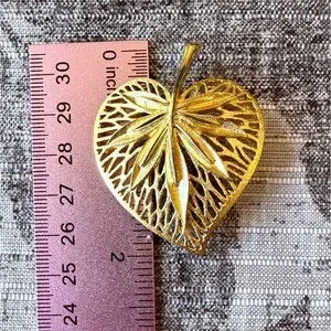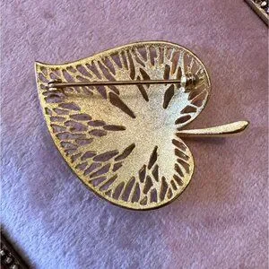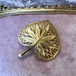 Vintage Gold-Tone Leaf-Shaped Brooch Pin With Intricate Filigree Design MCM