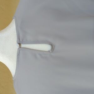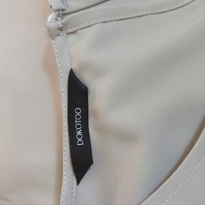This Amazon (Dokotoo) blouse showcases a relaxed fit with short, flutter sleeves and a pleated neckline, crafted in a soft gray hue. Its flowing silhouette, lightweight fabric. and cute keyhole with single-button-closure in the back, make it ideal for both casual and business casual settings. Shirttail hemline. Layer it or wear alone. Size Large.