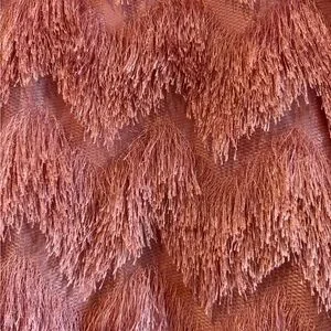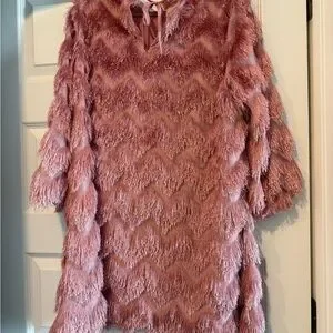 Stylish pink mini dress with chevron pattern. Features textured fabric and long sleeves. Perfect for a chic look.
