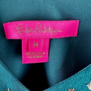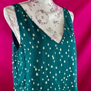 Keywords: Lilly Pulitzer, silk tank top, sleeveless top, metallic dot, green top, women's top, size M, V-neck top, designer top, silk blend, party top, casual top, summer top, blouse, shirt