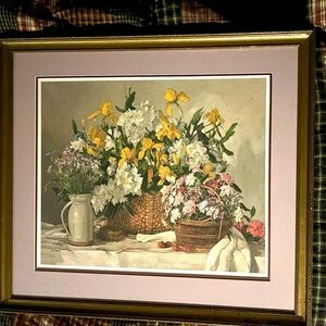 This signed limited edition 259/750 print by Della Roberts titled "Cycles" featuring her signature is a still-life composition that features multiple arrangements. Enhance your home with this beautiful floral still life art print. Featuring vibrant yellow, white, and pink flowers, this piece adds a touch of elegance to any room. The gold frame complements the artwork perfectly.