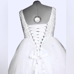 This is a brand new, pure white wedding gown(it was hard to get accurate photos of the dress)…without tags. There’s a label inside, but I can’t tell for sure if it’s a size tag. It does have the number 8 on the tag, and by looking at the dress on the form, it does look like it’s around a size 8. There is a fabric inset that lies under the lacing that goes up the back, but my mannequin was too large to make use of it. So, I just flipped it under and to the side of the laced section. The measurements are quite accurate when worn as the dress is depicted on the mannequin … with the fabric inset flipped under, and to the side of, the lacing. The bodice is all embellished with beads/sequins, but I couldn’t get them to show accurately, so I took artistic license to try to accentuate them! I also did the same to the skirt’s rhinestones because they didn’t show up in the photos. I hope all this helps.