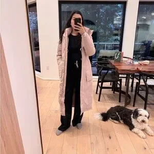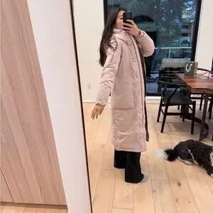 Stylish long pink puffer coat. Perfect for cold weather.