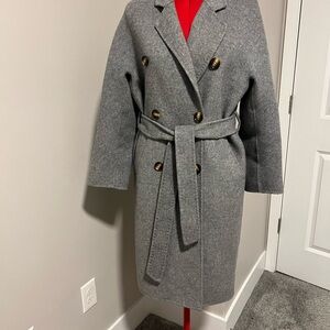 Elegant gray trench coat with striking gold buttons. Double-breasted design. Timeless style by MaxMara. The coat was purchased in Madrid in 2017. It's in perfect condition. It's from fall to spring and has no lining.