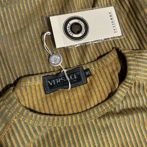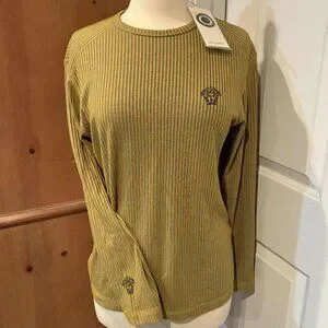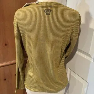 All logos on this top have a subtle sparkle. Gorgeous and never worn, new with original tag (it's not a price tag but a certificate of authenticity). Can't find any rips, stains, or damage. Laying flat, it measures approximately 18.5" across the chest (armpit to armpit) and 25" long. This is 100% cotton but has a beautiful stretch I presume from the weave/ribbing. The colors are a gold and somewhat olive green. Feel free to ask any questions. Smoke- and pet-free home.