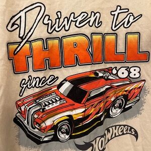 Beige Hot Wheels graphic tee featuring a bold “Driven to Thrill Since ’68” muscle car design on the front. Classic motorsport vibe with a vintage-inspired look. Soft and comfortable for everyday wear or casual street style.
