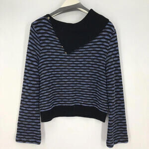 Women's St John Collection By Marie Gray Blue/Black Striped Sweater 12. There are gold buttons on the edge of the collar - it can be worn open as pictured or buttoned as a loose turtleneck or cowl. Excellent used condition - no signs of wear.