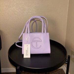 Chic Telfar mini bag in a soft lavender hue. Perfect for adding a pop of color.