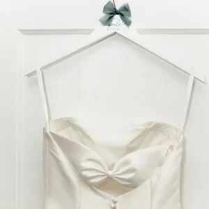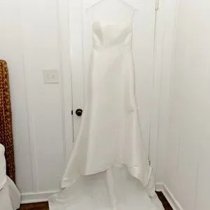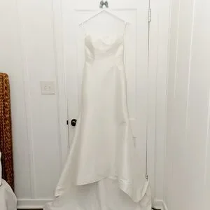 Beautiful strapless white gown with a flowing silhouette. Perfect for wedding. Comes with bow sleeves. Has been taken up under the arm a little. Most perfect dress!!!