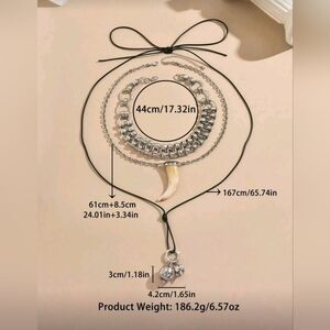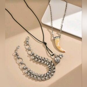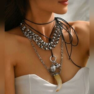 3 Multilayer Stacked Link Choker Animal Horn Pendant Necklace, & Leather Pendant Fashion Festival Silver Necklace