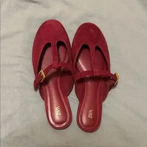 Chic red suede mules by Zara. Features a stylish gold buckle. Perfect for casual elegance.