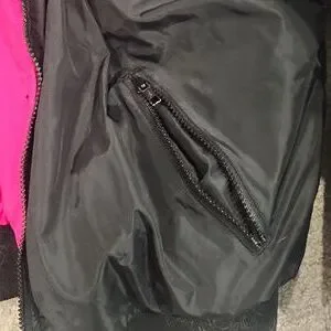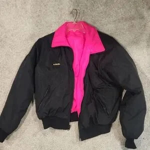 Stylish Columbia jacket featuring a sleek black exterior and vibrant pink lining. Ideal for both warmth and fashion. Can wear either side (black or pink) and has the Columbia brand tag and pockets on both sides! No size tag, my guess is medium or large.