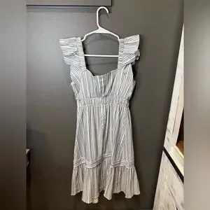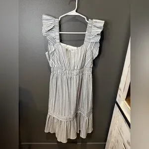 Elegant maxi dress with ruffle sleeves. Features a timeless striped pattern. Ideal for versatile styling.