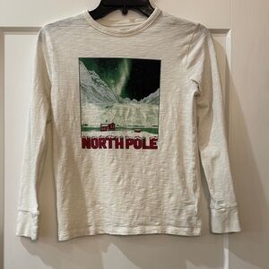 Cream long sleeve shirt with North Pole graphic. Features a scenic print with red and green accents.
