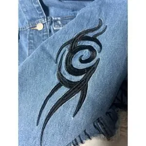 Edgy Current Mood cropped denim jacket with distressed hem and bold black graphic embroidery. Oversized, Y2K alternative vibe.