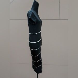Stylish black midi dress with white horizontal accents. Perfect for versatile wear.