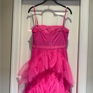 Elegant pink dress with layered design. Ideal for special events.