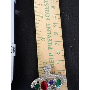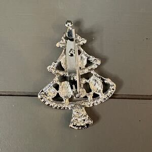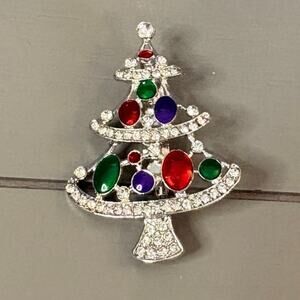 Add some sparkle to your holiday season with this beautiful vintage rhinestone Christmas tree brooch! This festive pin features shimmering clear rhinestones accented by jewel-tone stones in red, green, and purple, all set in silver-tone metal. It's perfect for collectors, holiday parties, or as a special gift.