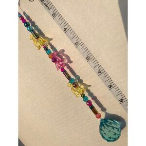 This one of a kind, handmade suncatcher is full of joy & whimsy! At 10.5 inches long this suncatcher has a variety of pink, yellow and blue glass & acrylic dinosaur shaped beads ending with a blue glass prism that will shower your space with light when the sun hits it! The beautiful design will bring that pop of color to just about anywhere from the patio to the bedroom! A small metal ring is attached to the top for easy mounting on a hook, nail or in a tree.
