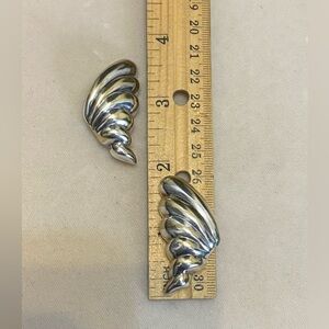 Bold and beautiful sterling silver clip on earrings. They remind me of a shell or a tornado. There is a very faint gold tone swirl around the edges of the swirl. Signed Mexico 925 and a Taxco makers mark that I can’t fully make out. Total weight is 19.59 grams. In great condition. About 1.75” top to bottom on longer side