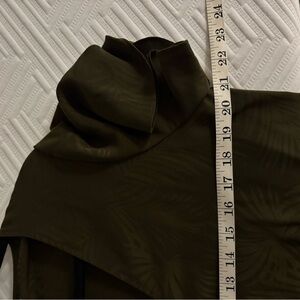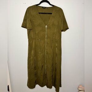 Elegant green dress with leaf design. Features a sleek zip-up front. Very flowy and lightweight