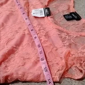 Very pretty lacy top with belt. High in front low in back. Measurements in photos. More of a peach color