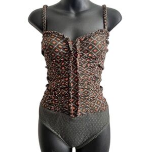 • Soft stretch mesh with swiss-dot sheer bottom, corset-inspired ruching through the front for a super flattering, cinched look