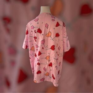 Stylish pink V-neck scrub top with a heart pattern. Perfect for casual wear.
